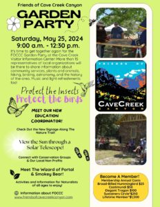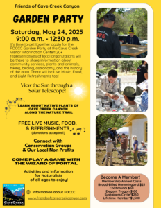 After two years of COVID restrictions, it’s time to get together again for the FOCCC Garden Party at the Cave Creek Visitor Information Center! Representatives of local organizations will be there to share information about community services, plants and animals, including jaguars, raptors, and insects; hiking, birding, astronomy, and the history of the area.